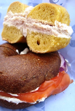 Whitefish salad on egg, Scottish lox & schmear on pump. Russ & Daughters, NYC.